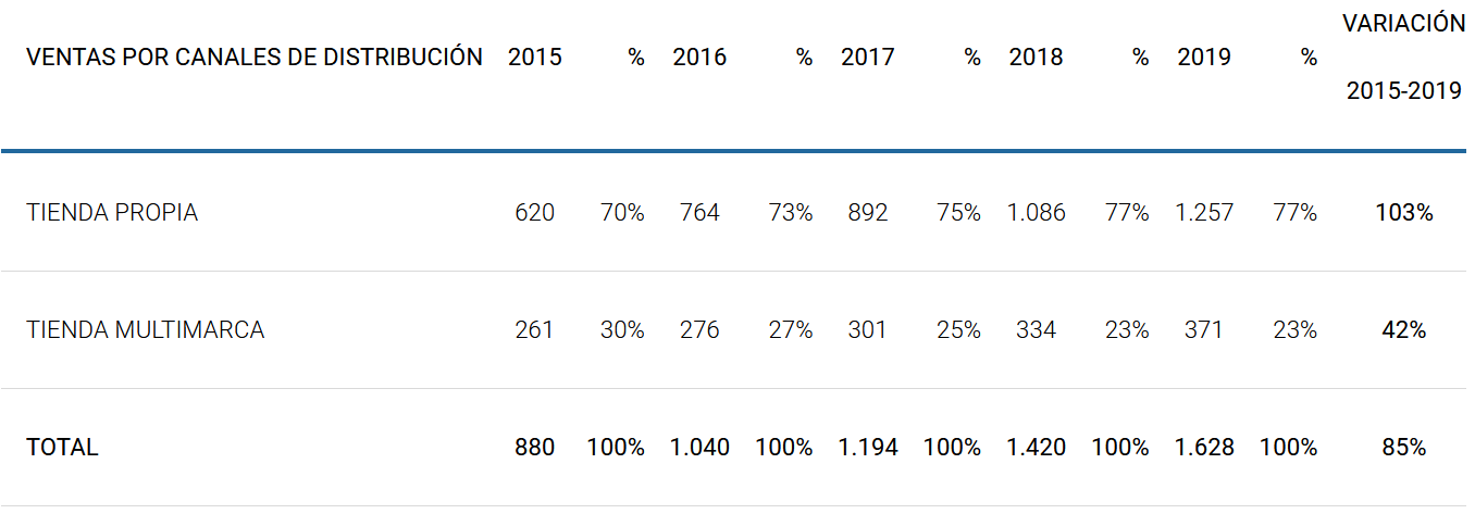 Donde podemos ver como las tiendas propias han ganado peso durante los últimos años.