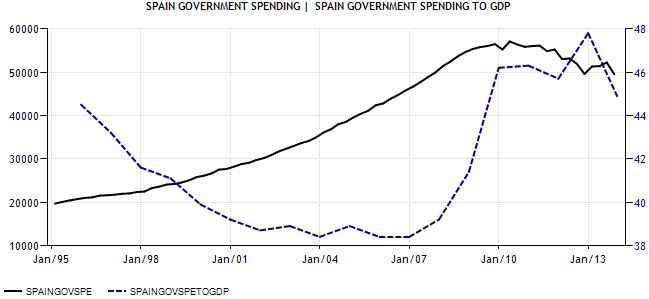 La línea negra refleja la disminución en Euros del gasto público, así como la línea azul muestra a su vez la caída del gasto en términos de PIB.