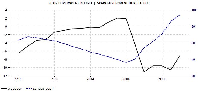 La línea negra refleja el déficit público desde su reducción desde el año 96 hasta el superávit registrado en los años 2006, 2007 y 2008, así como su vertiginoso aumento hasta cerca del -12% en 2009 y la lenta disminución a partir de entonces. La línea azul representa la caída del ratio deuda pública / PIB a partir de los años 97-98, cuando el déficit se sitúa por debajo de la barrera psicológica del -3% al -4% hasta alcanzar el superávit presupuestario, para a partir del 2009, cuando el déficit se dispara a cerca del 12%, aumentar drásticamente hasta nuestros días, cuando la deuda pública se sitúa cerca del 100% del PIB, es decir, que el Estado debe tanto casi como lo que nuestra economía es capaz de producir en un año. ¿La clave? Volver a un déficit público de menos del -4% ó -3% para que dicho ratio no resulte alarmante y comience a a reducirse para volver a niveles razonables, del entorno del 60%.