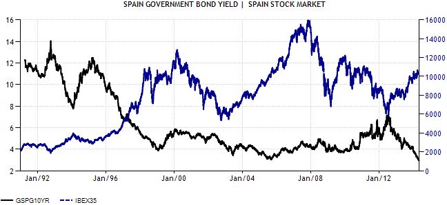No cabe duda de que el giro radical hacia las políticas de austeridad (disminución del gasto público mencionado en el punto anterior), sufridas por los ciudadanos de a pie eso sí, ha dado sus frutos y el mercado -con la ayuda de la poderosa dialéctica del BCE- ha dado un vuelco desde descontar el posible rescate de España (e Italia...), cuando los tipos de nuestro bono a 10 años (línea negra) se acercaban al 8%, hasta registrar mínimos históricos por debajo del 3%. Este gráfico demuestra que, pese a que muchos siguen escépticos, desde un punto de vista inversor, y considerando un menor potencial de mejora en el mercado de bonos, parece más razonable encontrar un potencial de revalorización sustancialmente mayor en la bolsa (línea azul), donde aún no se han vuelto a ver los máximos históricos de 2007.