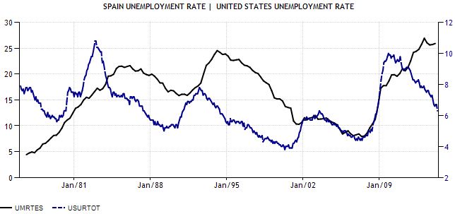 Mientras nuestra tasa de paro, disparada durante los últimos años, se resiste a bajar del 25% (línea negra) de manera decidida, la primera potencia económica del mundo, Estados Unidos, lleva reduciendo su tasa de paro (línea azul) desde el año 2010 desde el 10% hasta el actual 6.3%. ¿Envidia verdad? El tiempo les está dando la razón en cuanto a las recetas aplicadas (lo primero, detectar a tiempo la crisis, y después, aplicar una política monetaria ultra expansiva, un rescate rápido y ordenado de la banca y, por ende, provocar un aumento del déficit público puntual hasta el 10%, entrada en funcionamiento posterior de los ajustes presupuestarios automáticos (reducción del gasto público) y, en resumen, poseer unas instituciones fuertes, un mercado laboral flexible y aplicar unas políticas públicas apropiadas para que la iniciativa privada vaya asumiendo el relevo a varios años de "amortiguador público" y de política económica "semi-intervenida" por la FED).