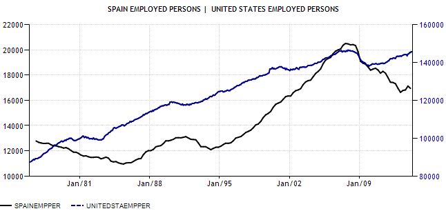 Aquí muestro otro gráfico menos sensible que el dato anterior para los ciudadanos de a pie, pero mucho más sensible para el mercado y las bolsas, que suben conforme lo haga el aumento del número de empleados (más factible cuando se espera un aumento de la población y un incremento del PIB), así como de la productividad (más factible por cuantos más avances tecnológicos se producen, como por posibles ajustes salariales, tal ha sido nuestro caso como veremos en el punto 4). Así, el número de empleados en EEUU (línea azul) se acerca a máximos de 2007, aunque su bolsa ha superado dichos máximos desde hace meses, mientras en España (línea negra) seguimos muy lejos de dichos máximos, por lo que es clave que el PIB vuelva a aumentar así como incentivar el crecimiento de la población (mediante políticas de ayuda para tener más hijos o estimulando la llegada de inmigrantes de manera ordenada y lo mejor preparados posible).
