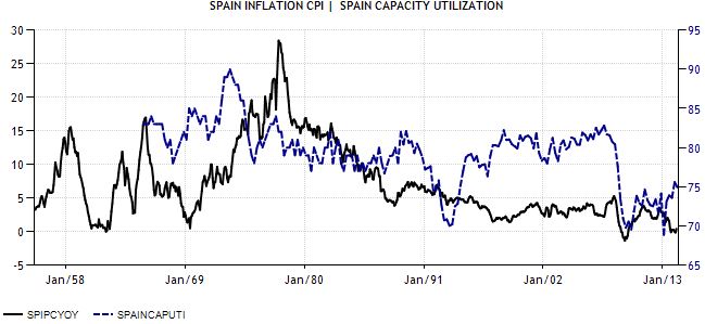 La teoría, y la práctica, nos dice que si la tasa (línea azul) ronda el 85% las presiones inflacionistas (línea negra) comienzan a hacerse más evidentes, y en la medida en que dicha tasa se reduce los precios tienden a crecer menos, es decir, se produce lo que últimamente venimos leyendo mucho "desinflación". Pero aquí destacaría la vuelta a la normalidad de nuestra industria, que cuanto más próxima a 80 se sitúe, los síntomas de una mayor actividad económica se hacen más palpables, y vamos camino de ello. Y con ello, una mayor inflación, aunque previsiblemente moderada.