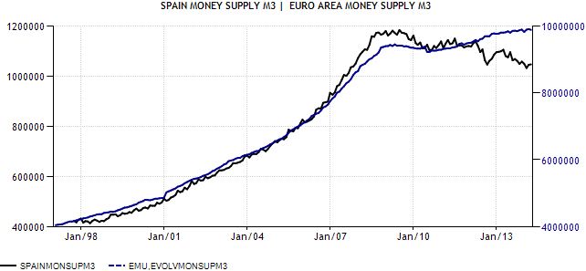La línea negra representa la M3 de España y la azul la de la zona Euro. Por sintetizar la M3 representa el dinero que fluye por nuestra economía (desde billetes hasta apuntes electrónicos bancarios, etc), es la sangre de cualquier economía, y una contracción de la M3 suele producir "paros cardiacos", como nos ha sucedido durante los últimos años. ¿Solución? Que el BCE pase de la dialéctica a la acción a tiempo y decididamente, aunque la verdad tengo muy poca confianza en que cumpla al 100% mis deseos y los de muchos otros economistas e inversores. Sin embargo, la mencionada vuelta de la confianza hacia nuestro país hará que flujos creados por el Banco Central Europeo que antes se iban directos a Alemania y a otros países del corazón de Europa vuelvan a España, normalizándose así esta etapa atípica de la economía europea comunitaria.