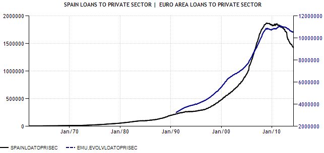 Y tras una contracción de la M3... viene la contracción del crédito. La línea negra muestra el crédito al sector privado en España, la azul en la Eurozona. Y al ser nuestro crecimiento más explosivo en los años precedentes, ha tocado un ajuste mayor, pero toca que se estabilice y comience aumentar en la medida en que los requisitos de capital -más severos- impuestos a la banca europea se hayan conseguido y el BCE haya hecho uso de sus herramientas de estímulo monetario.
