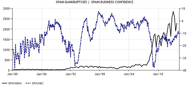 Según la línea negra, que representa la vertiginosa cifra de quiebras en nuestro país, parece haber comenzado a girarse a la baja mientras emerge una mayor confianza empresarial (línea azul) desde hace algunos meses de manera más nítida, aunque viene ya de años atrás.