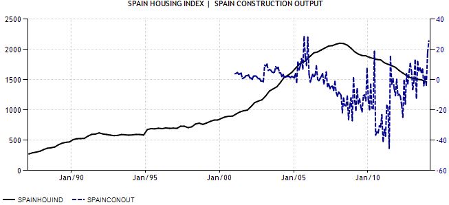 Aunque los precios de la vivienda (línea negra) siguen cayendo y se sitúan en niveles de 2004, la actividad de la construcción (línea azul) lleva repuntando meses, lo cual es reflejo de que en cualquier momento el suelo se producirá en el sector y comenzará a reflejarse en un nuevo alza de los precios, aunque aquí también es previsible que, con el cambio de mentalidad sufrido por todos durante la crisis y los incentivos al alquiler así como una esperada fiscalidad más dura para los propietarios, el aumento sea más moderado que en la etapa del "boom inmobilairio".