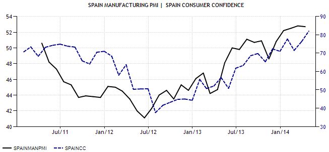 Clara mejora de ambos indicadores desde las famosas palabras de Draghi en Julio de 2012 cuando se comprometió a hacer lo que fuera para salvar al Euro. Te esperamos Mario. Así, tanto el PMI (línea negra) como la confianza del consumidor (línea azul) adelantan mayores alzas del PIB, del empleo y de los mercados.