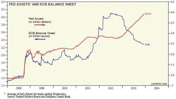 - Compra de activos (podrían ser tanto públicos como privados) y el programa, -el cual se conocerá en mayor detalle en Octubre, mes en el que daría comienzo- contempla la compra de titulaciones ya existentes y nuevas, así como de cédulas inmobiliarias, comprando así una amplia cartera de activos ABS en un proceso que, según las estimaciones del BCE, podría catapultar su balance de 2 billones de euros a los 2.7 que tenía a comienzos del 2012, porque como vemos a continuación, el balance del BCE, lejos de ampliarse en plena crisis, se ha achicado frente a la expansión de la FED. Esto allana el camino hacia un QE a la europea.