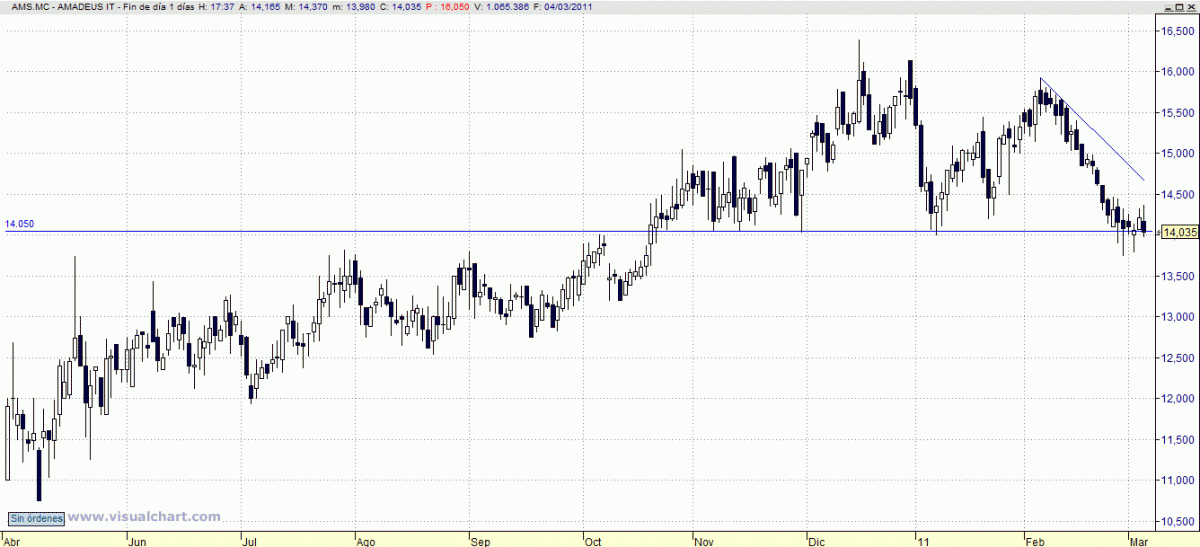 Título que en la actualidad admite, dado el tremendo nivel de soporte que está tanteando, una doble posibilidad estratégica: Por un lado, se pueden tomar posiciones compradoras con stop loss en 13,60 en precios de cierre; por otro, en el momento que cierre por debajo de 13,70 admite posiciones vendedoras con stop loss en 14,10