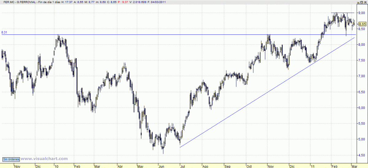 Pese a las subidas de los últimos meses, sigue teniendo el buen aspecto que le proporcionan cierres continuados por encima de 8,50. Dada la inestabilidad del mercado, conviene dinamizar el stop de beneficios hasta 8,90