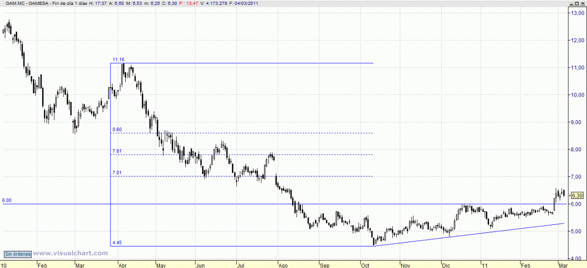 Pese al último retroceso, ha confirmado plenamente el escenario alcista que nos parecía probable tras la ruptura de la zona de 6,00. Conviene dinamizar ya el stop de beneficios hasta los 6,40.