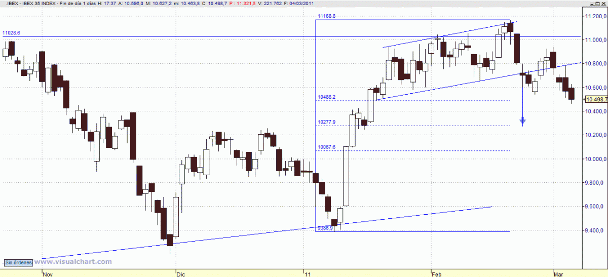Sólo el Ibex ha dado muestras de bastante debilidad, reflejada en un cierre semanal que augura continuidad de las caídas. No sólo porque sigue vigente el hueco bajista que nos ha dejado en 10.760, sino porque también ha construido nuevos mínimos relativos que nos hacen pensar en búsqueda de niveles de corrección superiores, hacia los 10.270 y 10.060. Sólo con cierres por encima de 10.760 y de 10.940 volveríamos a la situación lateral-alcista anterior.