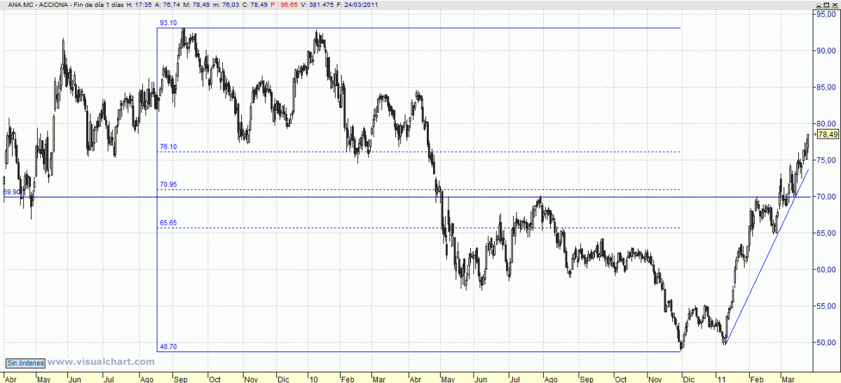 Muy bueno, como parecía previsible, el comportamiento alcista desde que rompiera por encima de 70,00. Por tanto, se pueden mantener las posiciones compradoras, pero dinamizando ya el stop de beneficios hasta los 76,50