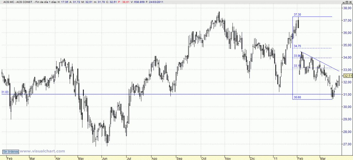 Por tercera vez consecutiva desde agosto pasado, todo ha sido tocar la tremenda zona de soporte de los 31 euros, y rebotar con fuerza. Si el movimiento de recuperación es similar a los anteriores, le queda un buen trecho al alza. Se pueden plantear compras con stop loss en la zona de 31,30 en precios de cierre. Ya en beneficios, subimos el stop de los mismos hasta 31,70