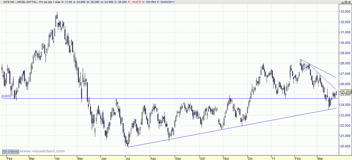 La zona cercana a los 24,00 supuso en diferentes ocasiones una fuerte resistencia para el avance del precio, por lo que pudiera perfectamente convertirse en importante soporte que detenga el deterioro. Ya en beneficios, merece la pena subir el stop hasta los 24,75