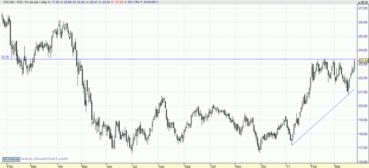 El movimiento alcista último ha hecho saltar el stop de beneficios que teníamos, pero de nuevo se está acercando a la resistencia de medio plazo que presenta en 23,30, por lo que se pueden plantear estrategias bajistas con stop loss en 23,50 en precios de cierre