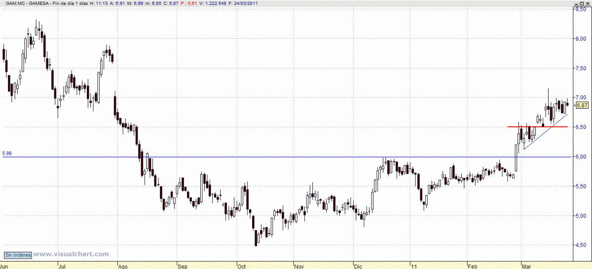 Pese al último retroceso, ha confirmado plenamente el escenario alcista que nos parecía probable tras la ruptura de la zona de 6,00. Conviene dinamizar ya el stop de beneficios hasta los 7,00 en precios de cierre.