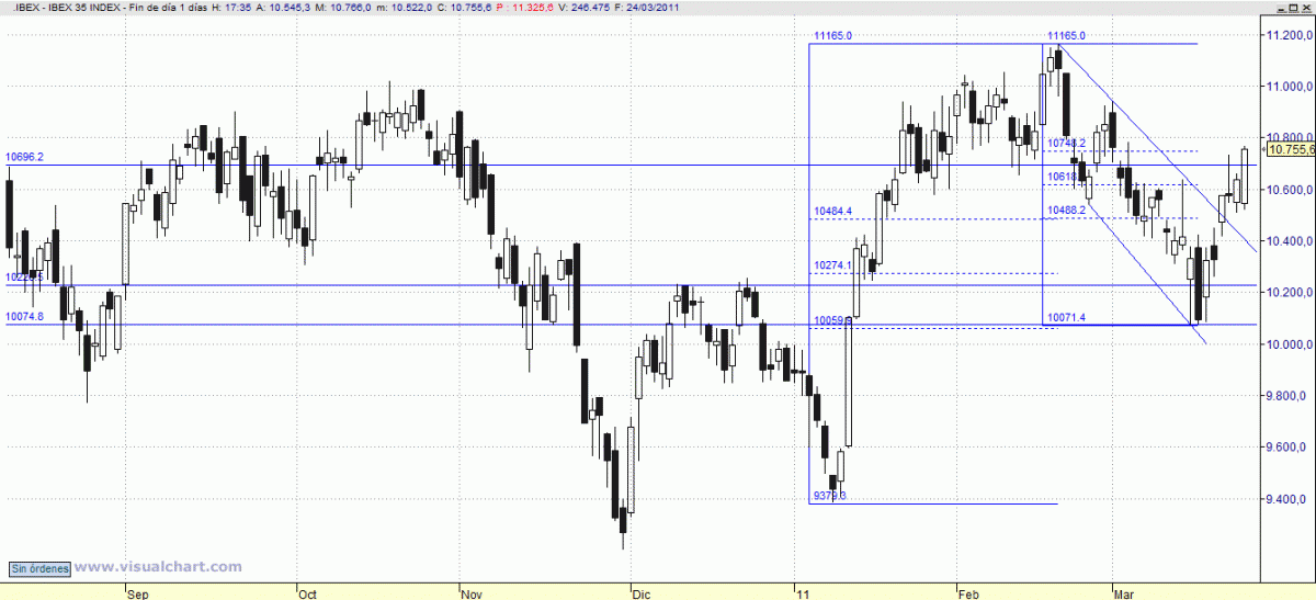 El Ibex está tanteando las importante zona de resistencia que presenta en 10.750, por encima de la cual se alejaría el peligro de cesiones añadidas para entrar en un contexto que pudiera desembocar en nuevos ataques a los máximos anuales en 11.165. Para ello es preciso que suceda algo similar en los grandes índices europeos, que todavía se encuentran en proceso de buscar el 0,618% de toda la caída ( nivel, justamente, en que se encuentra el Ibex), siendo posible que nuestro índice se descorrelacione levemente, sin acompañar las previsibles nuevas subidas de Europa.