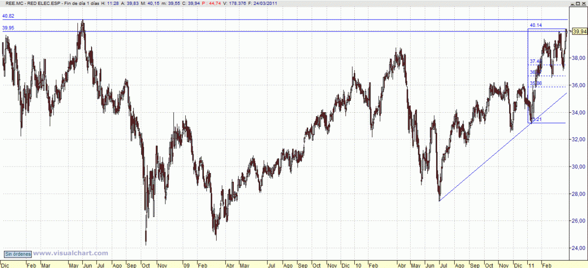 Acercándose, no sólo al nivel del máximo relativo anterior, sino también a los máximos históricos que tiene en 40,80. Creemos poco probable, en el actual contexto, que sea capaz de sobrepasarlo, por lo que planteamos estrategias bajistas, con stop loss en 41,00 en precios de cierre