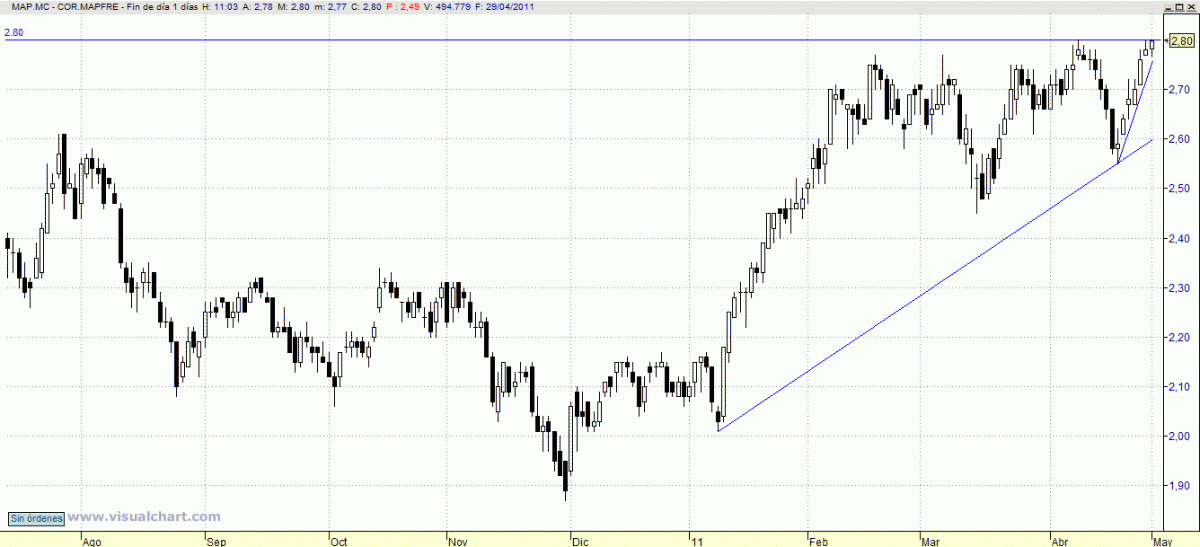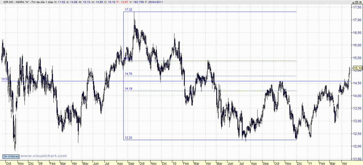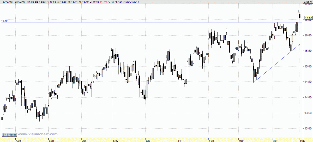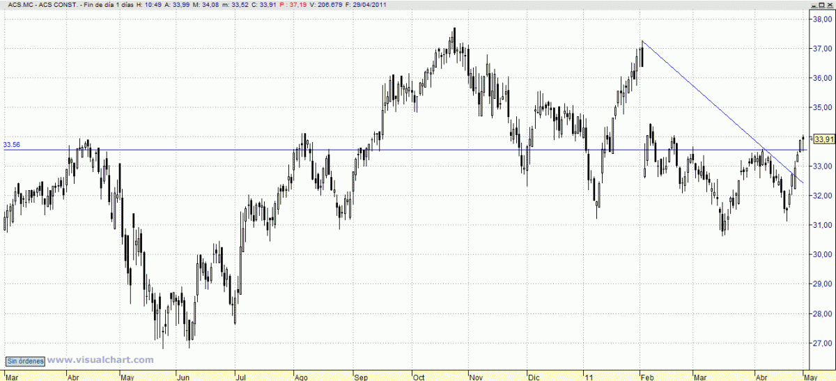 De nuevo por encima de la resistencia intermedia que tiene en 33,50. Se pueden tomar posiciones compradoras en previsión de que pueda empezar a rellenar el importante hueco bajista con origen en 34,50. Stop loss, en 32,95 en precios de cierre