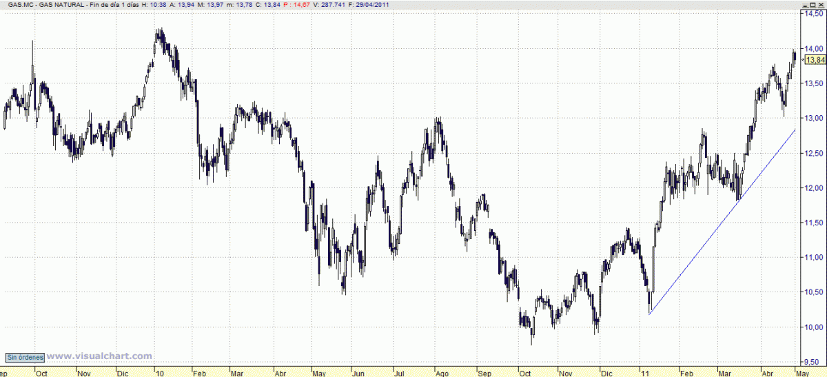 Parece capaz de alcanzar la resistencia de medio plazo de los 14,30, por lo que se pueden tomar posiciones compradoras con stop, ya de beneficios, en la zona de 13,40 en precios de cierre