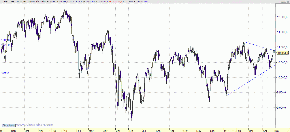 Los niveles a vigilar en el Ibex 35 son los que delimitan la tangencia con las directrices de la formación triangular actual: Por un lado, los 10.900 como resistencia inclinada; por otro, los 10.380 de soporte. La resolución ahora mismo se antoja incierta y, a poco que continúen las subidas, cada vez serán menores las posibilidades de correcciones cuantiosas