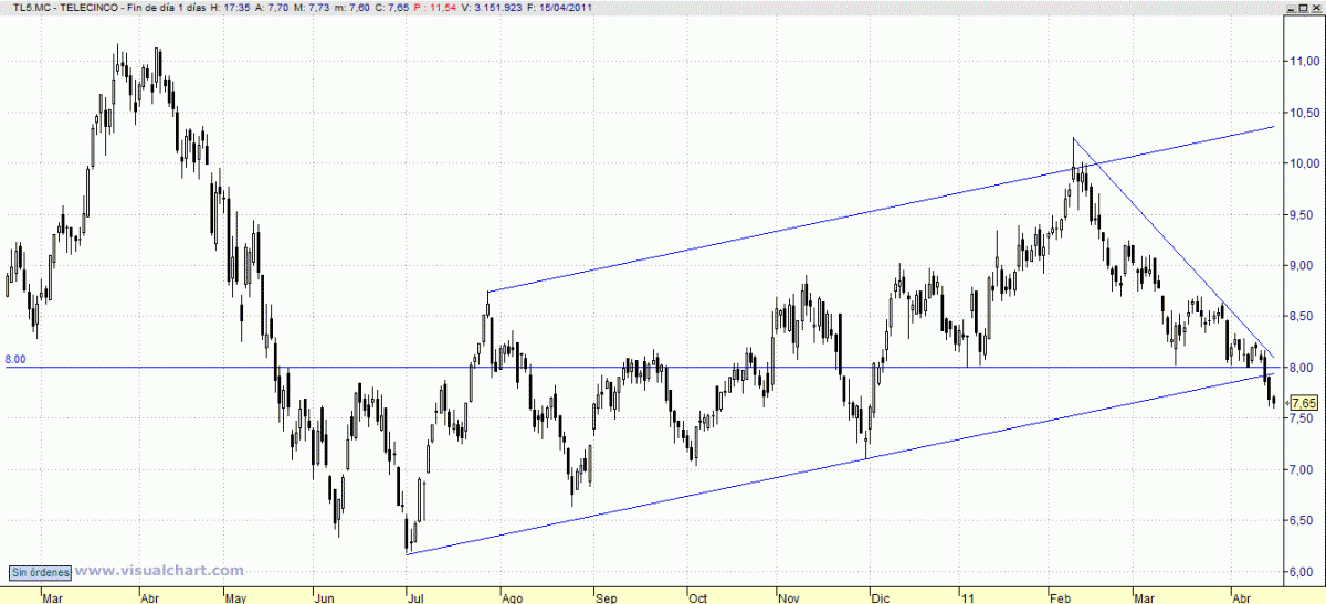 En contra de lo que nos parecía probable, no sólo no ha rebotado en el soporte de los 8,00, sino que parece corregir hasta los 7,00, por lo que planteamos estrategias bajistas con stop ya de beneficios en 7,75