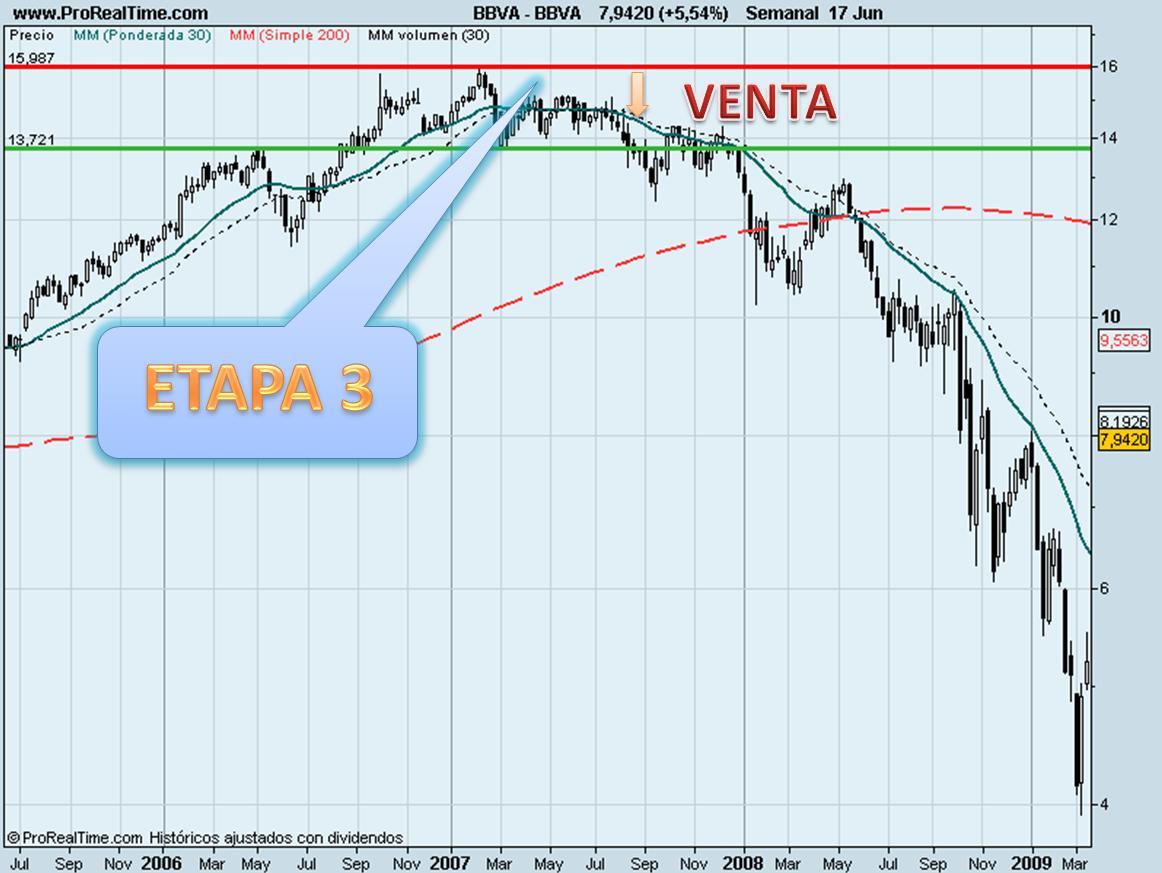 Hay que jurarse a uno mismo que jamás se comprará en una etapa 4, ni tampoco se mantendrá en cartera un valor que haya entrado en esta fase.