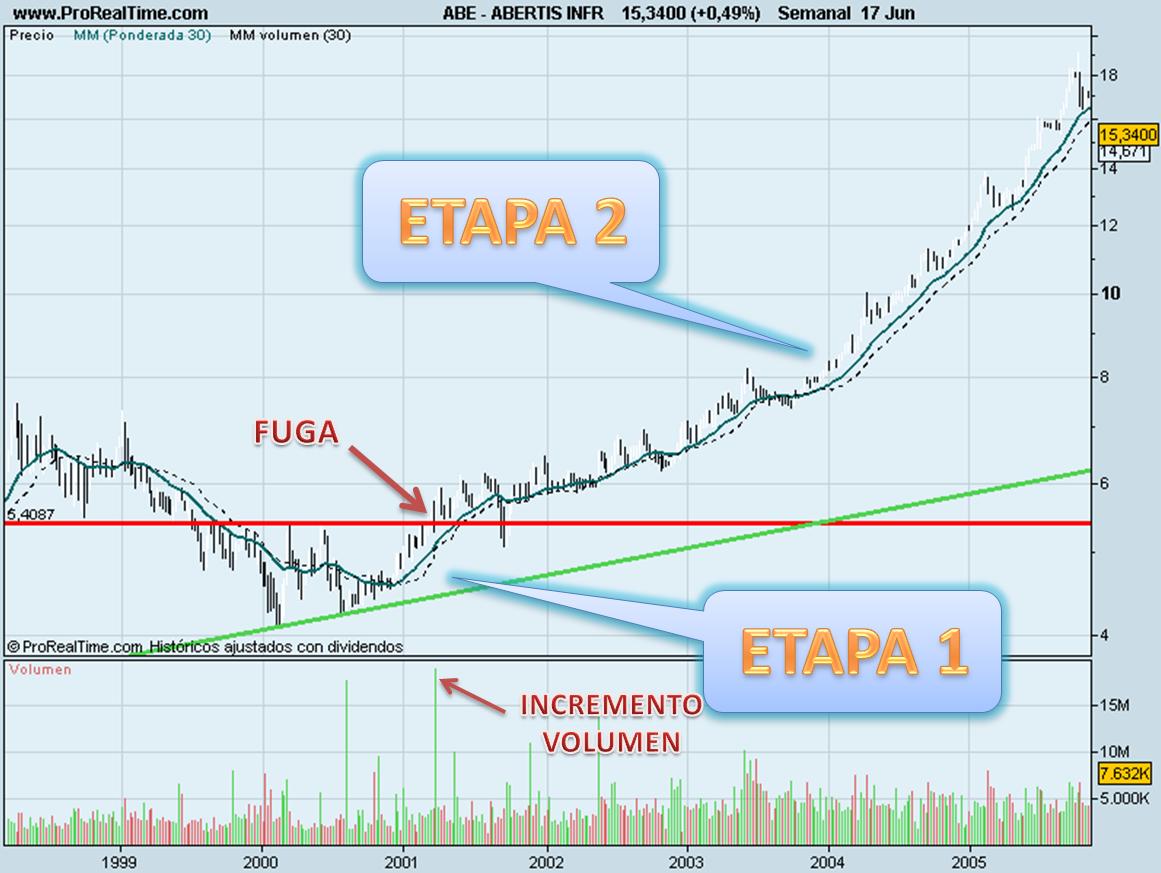 Cuando se produce la rotura de la resistencia de la gama operativa de la etapa anterior, además de romper la media de 30 semanas hacia arriba, y empezar esta a coger inclinación positiva. Es muy importante que esta rotura vaya acompañada de un aumento considerable de volumen, para que el movimiento tenga una cierta consistencia.