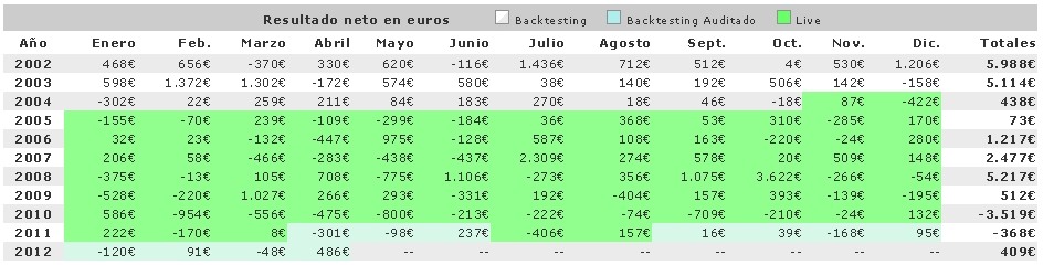 Como vemos en la tabla, este sistema tiene datos "backtesting" desde enero 2002 hasta agosto 2010, datos "backtesting auditados" desde septiembre 2010 hasta febrero 2011 y datos "Live" desde marzo 2011 en adelante. Como en los datos Live solo se consideran las cuentas que siguen estando activas en este momento, se puede dar el caso que un cliente operase este sistema en el periodo octubre 2010 a enero 2011 pero cerrara su cuenta en mayo 2011. En ese caso nos encontraremos con que los datos de esos meses no apareceran como datos "Live".