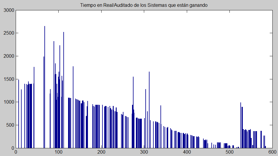 Podríamos pensar que existen más sistemas ganadores que lleven menos tiempo, pero la gráfica nos sorprende con un porcentaje elevado de sistemas que están ganando y llevan bastante tiempo en real.