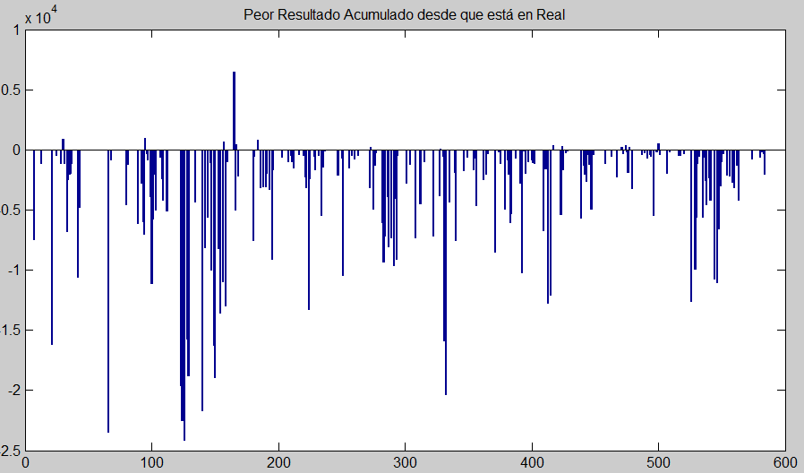 Para estar obteniendo estos beneficios los sistemas han pasado por momentos mejores y peores. A continuación muestro un gráfico con los peores momentos que han vivido cada uno de los sistemas, teniendo en cuenta que se optara por la estrategia de activar el sistema y mantener (estrategia, que desarrollaré en futuros artículos, y veremos que es perdedora a largo plazo con una probabilidad muy alta)