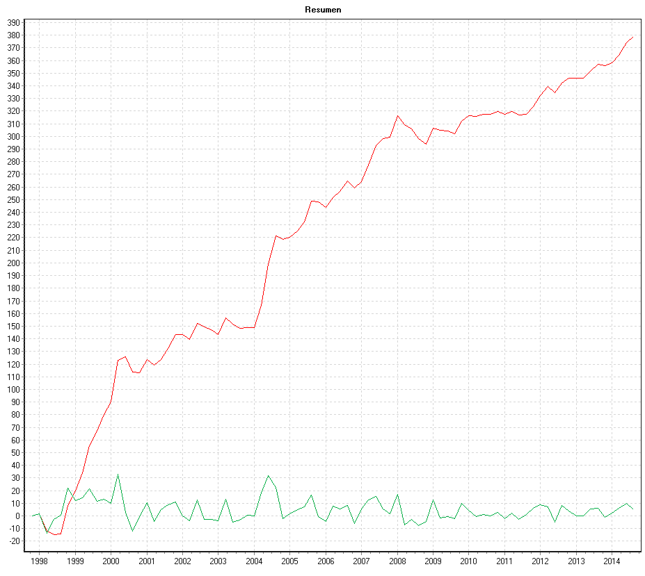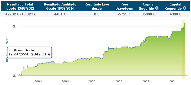 A continuación mostramos los datos referentes a un modelo que lleva ejecutándose en cuentas reales desde hace más de dos años con muy buenos resultados y actuando sobre muchos activos de diferente tipo. Su curva y tabla de resultados sobre el futuro del Mini Dow Jones (comisiones, slippage y lease fees descontadas) son las siguientes: