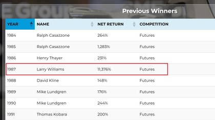 En consecuencia, con el paso del tiempo se ha consolidado como una de las competiciones más prestigiosas, en parte porque de aquí surgieron figuras tan conocidas como Larry Williams -el creador del famoso Oscilador Williams %R-, quien en 1987 marcó uno de los hitos más famosos del trading moderno, al convertir 10.000 dólares en más de 1.100.000 dólares, o lo que es lo mismo un +11.300% en 12 meses de competición.