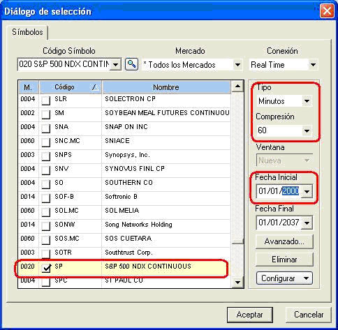 11.- Seleccionar el instrumento SP500 NDX CONTINUOUS como en la imagen y fijándonos en los parámetros señalados en rojo: