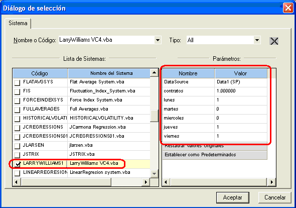 15.- En este momento podemos modificar los parámetros que vienen por defecto, en este ejemplo vemos los parámetros del sistema de Larry Williams, si quisiéramos cambiar los días en que se ejecutara (por defecto lunes, jueves y viernes) deberíamos cambiar a 1 los días de nuestro agrado y el resto a 0. Seguidamente pulsamos “Aceptar”