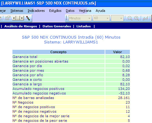 En este punto es crítico seleccionar correctamente el tipo de gráfico que queremos, si va a ser un gráfico diario, minutos, ticks… para ello es necesario modificar los parámetros de la esquina superior derecha de la imagen encuadrados en rojo “tipo” y “compresión” para el ejemplo que nos ocupa el sistema de Larry Williams hay que seleccionar Tipo = Minutos y Compresión = 60.