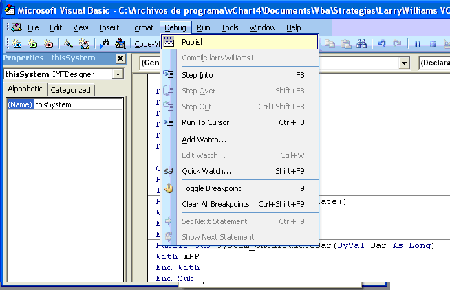 7.- Seleccionar del menú “Debug” la opción “Publish”: