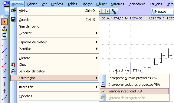 8.5.- Seleccionar del menú “Archivo” la opción “Estrategias” y subopción “Verificar integridad VBA” y esperamos unos segundos, pues no nos mostrará ningún mensaje de aviso de la finalización de la verificación.