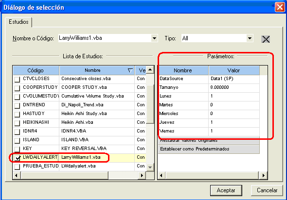 15.- En este momento podemos modificar los parámetros que vienen por defecto, en este ejemplo vemos los parámetros del estudio de Larry Williams, si quisiéramos cambiar los días en que se ejecutara (por defecto lunes, jueves y viernes) deberíamos cambiar a 1 los días de nuestro agrado y el resto a 0. Seguidamente pulsamos “Aceptar”