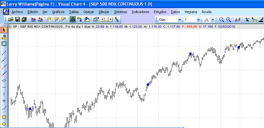 En el caso que nos ocupa en la imagen se muestran sobre puntos azules las potenciales entradas del Sistema Larry Williams explicados en el post: ¿Ganamos y ganaremos dinero con Larry Williams?