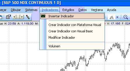 13.- Cuando aparecen la cotizaciones entonces seleccionamos del menú “Indicadores” la opción “Insertar Indicador”