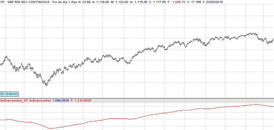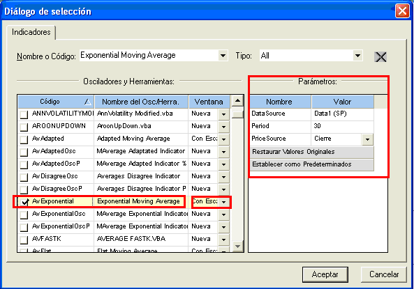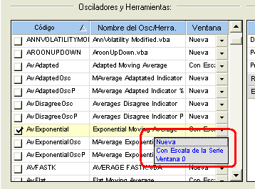 Tanto la opción “Con Escala de la serie” y “Ventana 0” nos dibujará nuestro indicador sobre el gráfico de cotizaciones con la diferencia que la primera se redibujará cada vez que cambiemos la escala de nuestro instrumento y la otra no