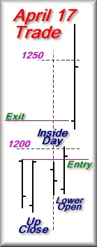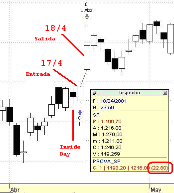 Larry Williams aplica este método al mismo índice SP500 (no confundir con el miniSP) de hecho el gráfico que él mismo expone como ejemplo es del día 17 de Abril del 2001 donde el sistema expuesto consigue 22,8 puntos de ganancia con 1 solo contrato.