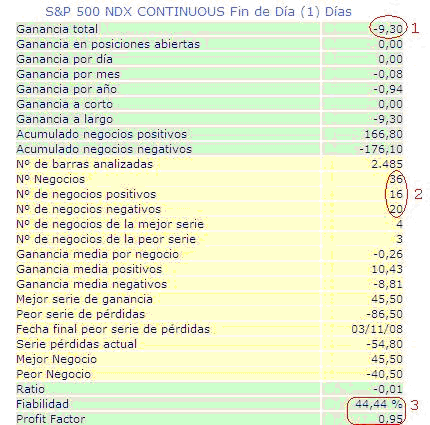 1) El primero se trata de la Ganancia total, como podéis ver en la imagen es de -9,3 puntos, sí! es negativo, después de 10 años de ejecutar este sistema según las pruebas o backtesting nos dice que hoy perderíamos 9,3 puntos por contrato.