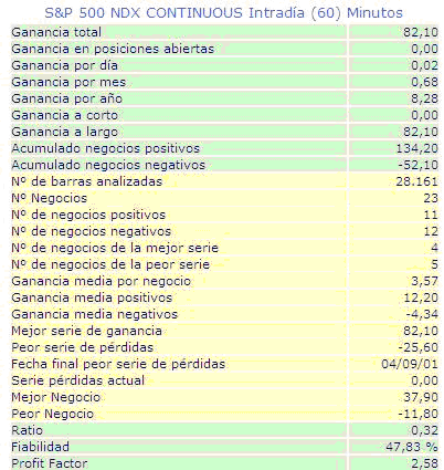Finalizada la primera prueba, que a más de uno hubiese hecho descartar este sistema, preferí desarrollarlo con una mayor granularidad para adaptarlo exactamente a la estrategia de entrada descrita (ver criterios de entrada), por lo que pasé a construirlo en barras de 60 Minutos. Vamos a ver sus resultados.