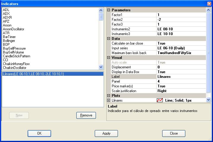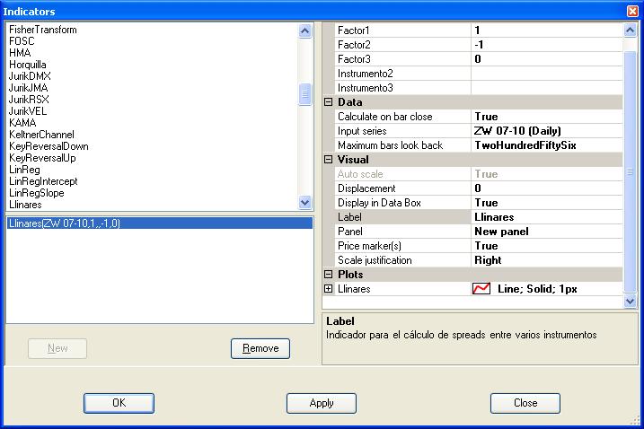 Los parámetros de entrada son Factor1, Factor2 y Factor3 como multiplicadores del precio de cotización, el resto Instrumento2 e Instrumento3 no son obligatorios y se actualizan automáticamente cuando añades más de un activo o instrumento en un gráfico.