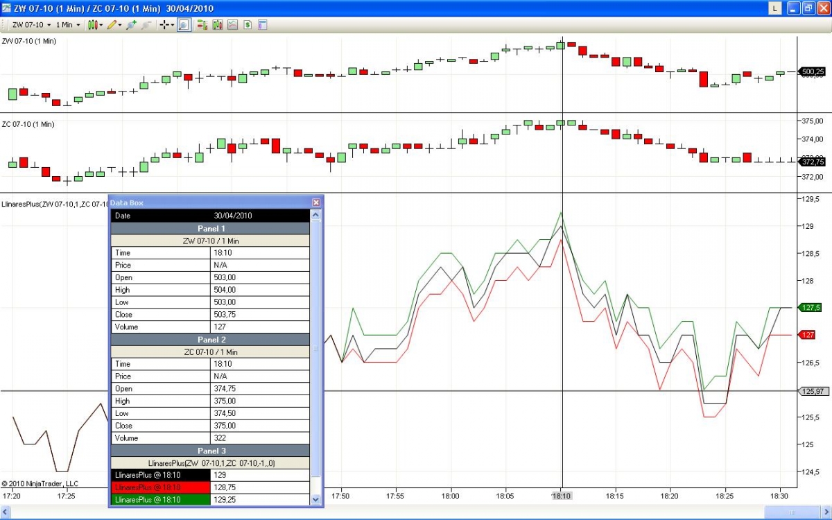 Aprovechando que Ninja Trader 7 pone a nuestra disposición la graficación de spreads (varios instrumentos en un mismo gráfico) he desarrollado el nuevo indicador LlinaresPlus para que veamos el precio Bid (oferta) y Ask (demanda) además del último precio cruzado (Last) de esta manera en todo momento podremos ver el precio de la horquilla de los spreads configurados con este indicador.