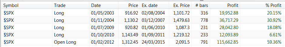 Si hacemos un backtest desde el año 2003 hasta la actualidad, vemos que hay únicamente 5 compra-ventas, con períodos de mantenimiento de incluso más de 2 años (a fecha de hoy, 791 días):